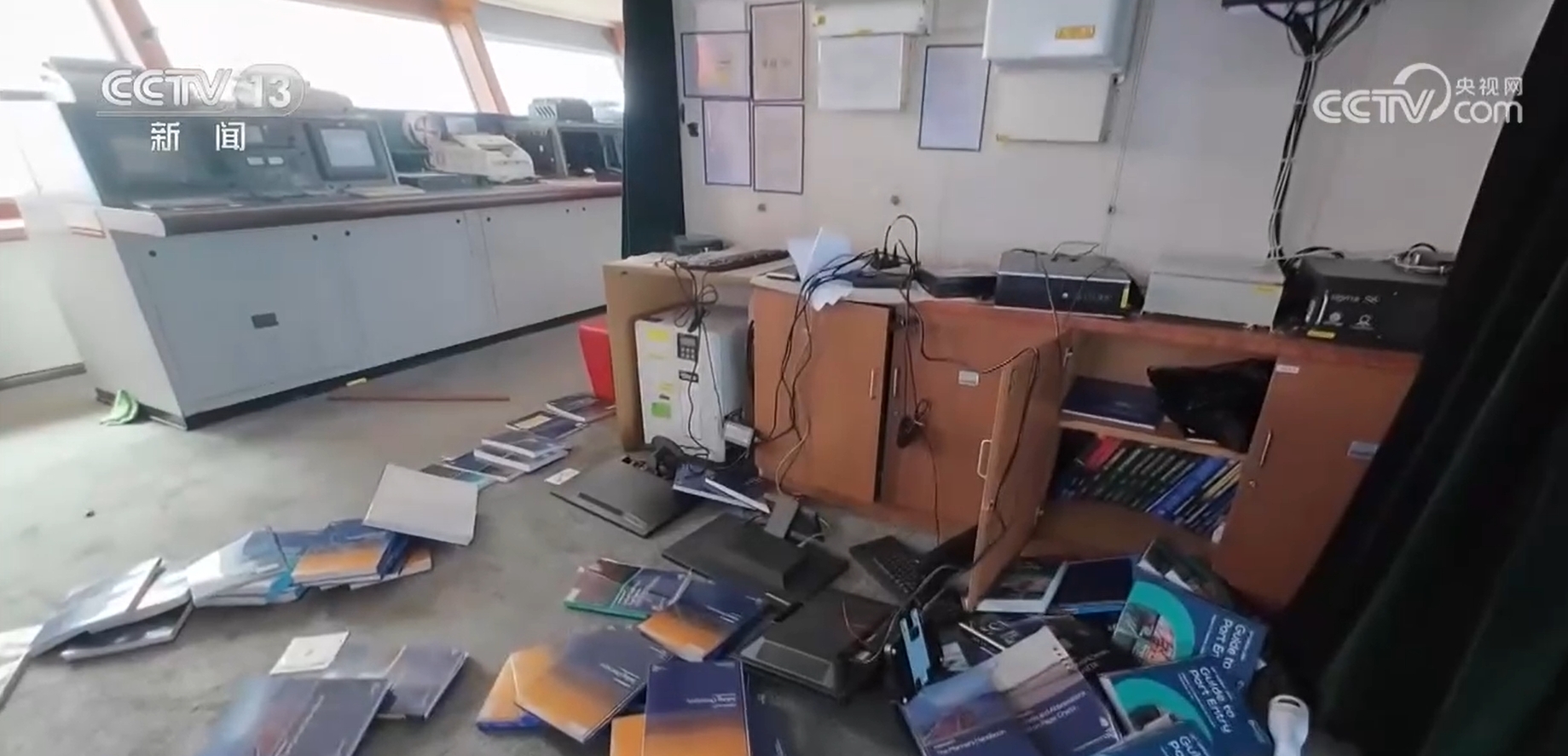 在这样的大幅晃动下,船上的很多物品都遭了殃。六楼的气象室里一片狼藉,各种物品洒落一地;七楼的驾驶台,各种工具书散在了地毯上。而这种剧烈的晃动是持续性的,大家根本来不及去收拾。