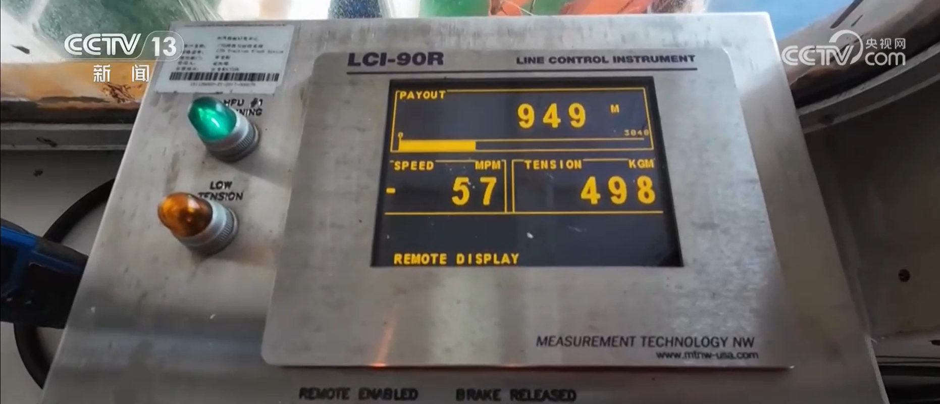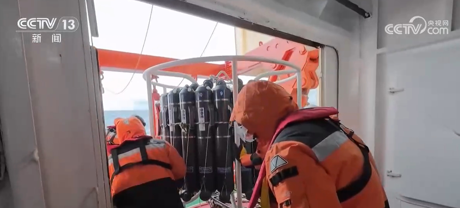 中国第42次南极考察队“雪龙”号大洋队队员 闭俊舟:CTD(温盐深仪)上面有一个莲花头,头上有一个线缆,能够实时连接到我们的操作单元。当我们按下这个(控制按钮)的时候,那个莲花头会释放,上下两个瓶口就会同时闭合,就完成了一次采水的操作。