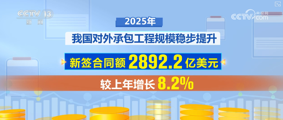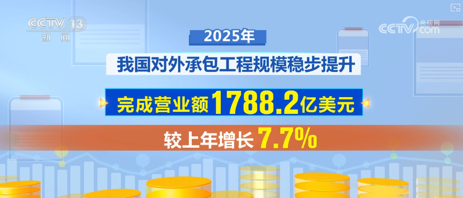 2025年,我国对外承包工程规模稳步提升。完成营业额1788.2亿美元,较上年增长7.7%;新签合同额2892.2亿美元,较上年增长8.2%,均创历史新高。