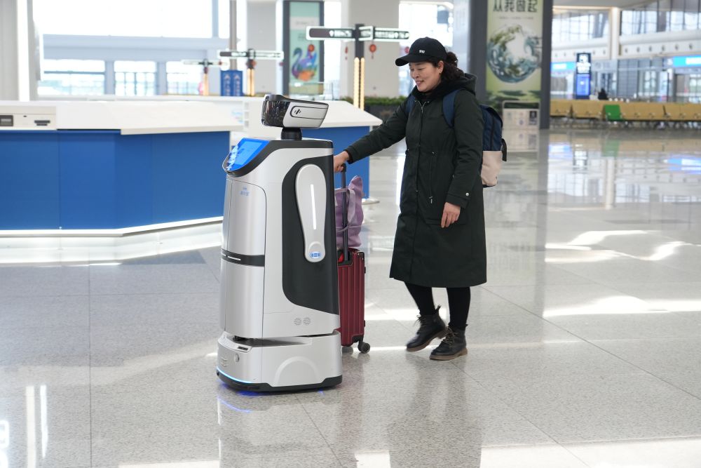 在福州南站,智能服务机器人“阿福”春运首日正式上岗,为乘客提供智慧出行体验。