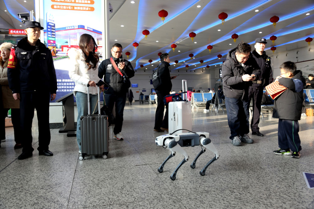 2月2日,在江苏省连云港站,徐州铁路公安处的机器狗在候车大厅巡查。新华社发(王春 摄)