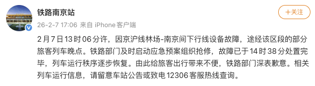 央视网消息:2月7日,@铁路南京站 发布通报:2月7日13时06分许,因京沪线林场-南京间下行线设备故障,途经该区段的部分旅客列车晚点。铁路部门及时启动应急预案组织抢修,故障已于14时38分处置完毕,列车运行秩序逐步恢复。由此给旅客出行带来不便,铁路部门深表歉意。相关列车运行信息,请留意车站公告或致电12306客服热线查询。