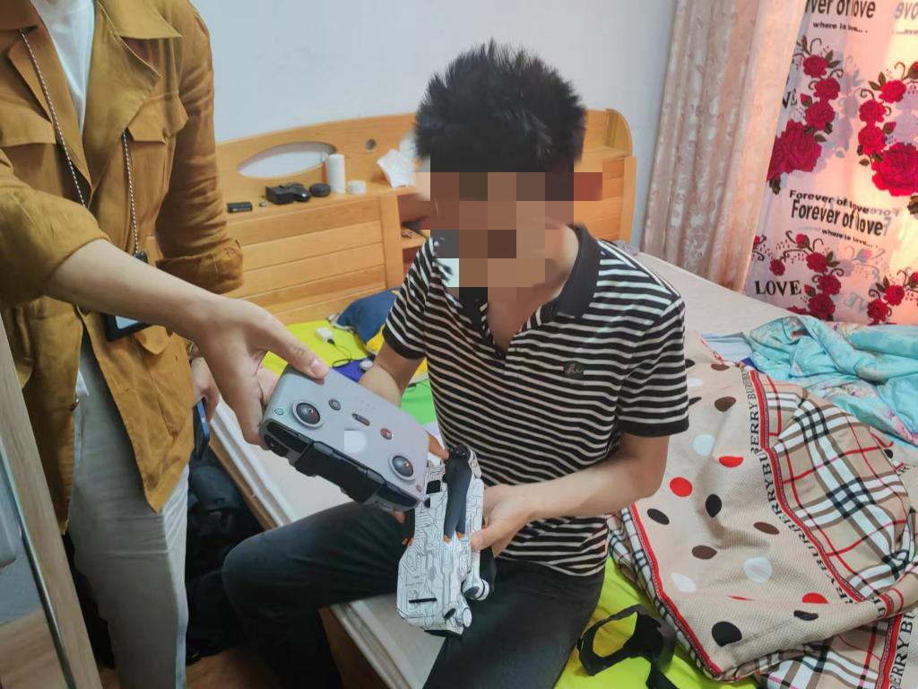 图为警方搜查嫌疑人住所,查看涉案无人机。(海曙区公安分局供图)
