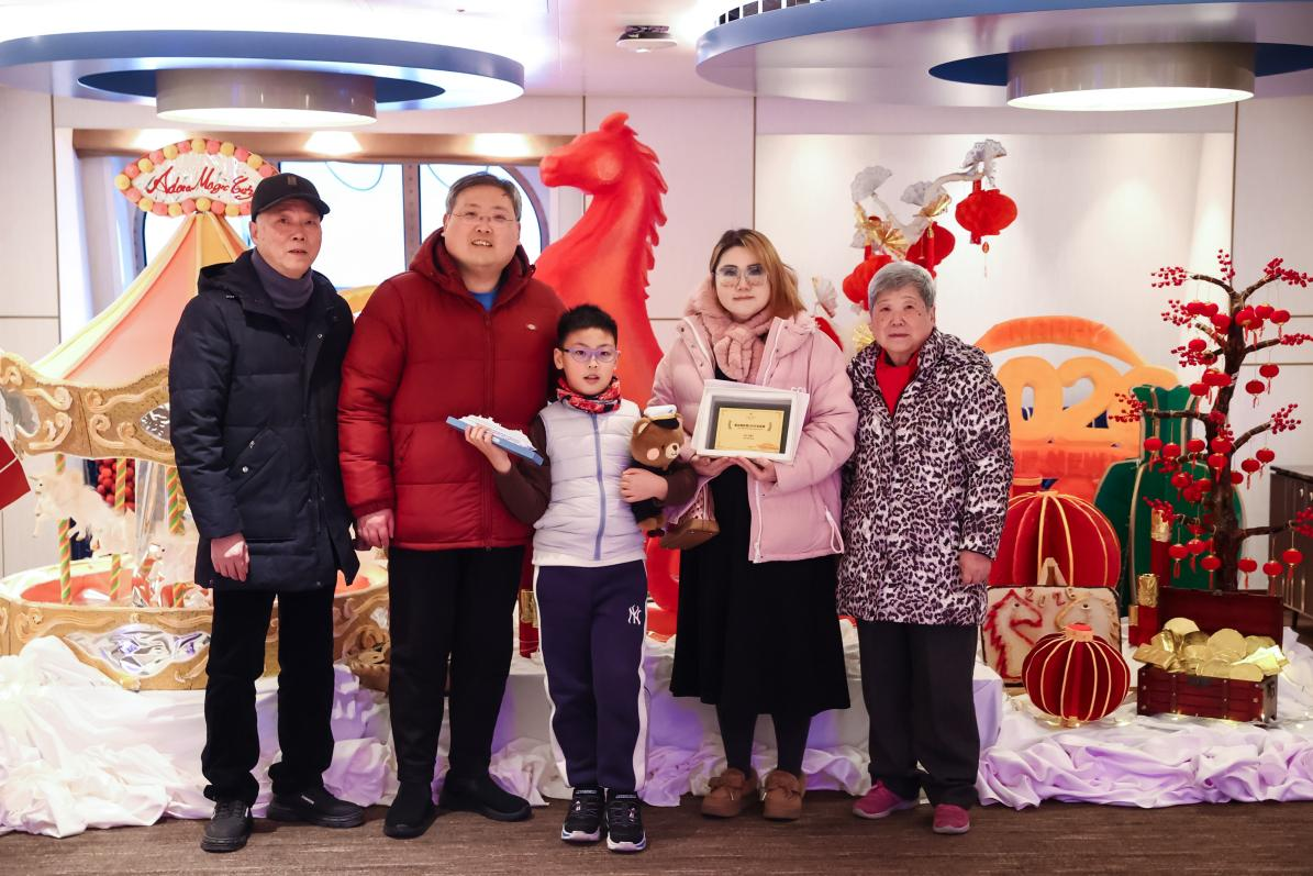 李琳:我是带着一家五口邮轮旅行,因为我公公70岁生日,我想让他可以有更舒适的旅行体验,所以选择了邮轮旅行。而选择“爱达·魔都号”是因为它是第一艘国产大型邮轮,我们很想来感受一下。本来就是一次普通的旅游,结果成了第100万名乘客,这个惊喜我终生难忘。