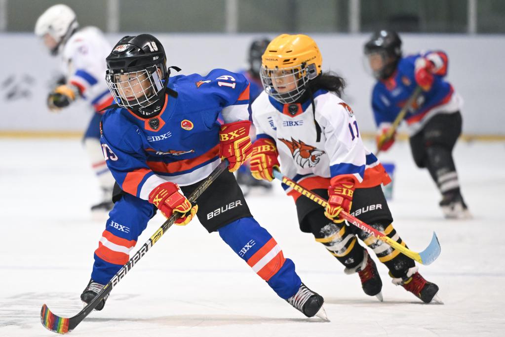 1月25日,在齐齐哈尔市的黑龙体育馆内,二马路小学翼虎冰球队队员刘金梓晨(左)在训练中。新华社记者 张涛 摄