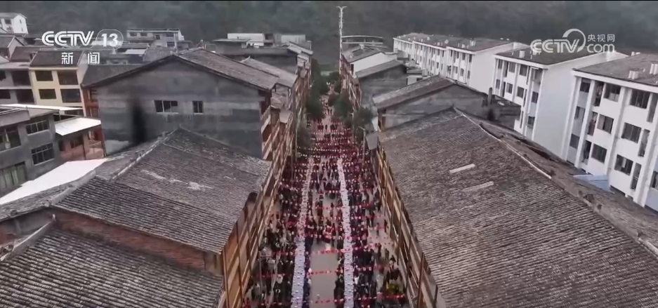最热闹的是土家族长桌宴。上百张长桌沿街摆开,热气腾腾的刨猪汤、石磨豆腐等地道美食,不仅分享着村民们丰收的喜悦,还传递了团圆的温情。为了增强游客的体验感,今年当地还增设了“挑粮竞速”“手力比拼”“竹箭投壶”等互动项目,让传统年俗焕发新活力。