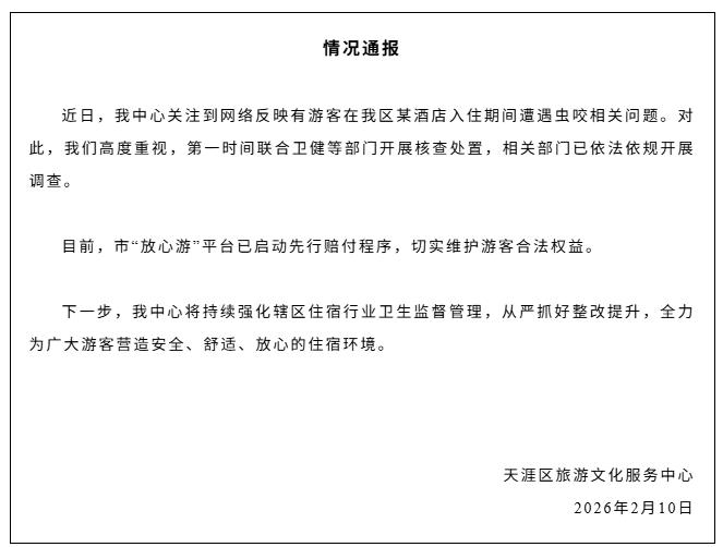 央视网消息:据“天涯旅文”公众号消息,三亚天涯区旅游文化服务中心发布情况通报:近日,我中心关注到网络反映有游客在我区某酒店入住期间遭遇虫咬相关问题。对此,我们高度重视,第一时间联合卫健等部门开展核查处置,相关部门已依法依规开展调查。目前,市“放心游”平台已启动先行赔付程序,切实维护游客合法权益。下一步,我中心将持续强化辖区住宿行业卫生监督管理,从严抓好整改提升,全力为广大游客营造安全、舒适、放心的住宿环境。