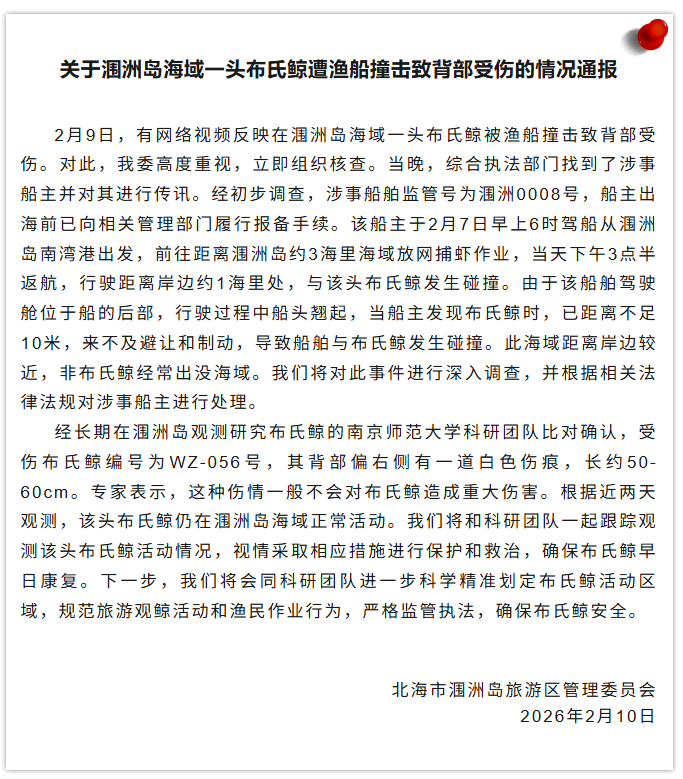 ·官方通报涠洲岛海域一头布氏鲸被渔船撞击致背部受伤。