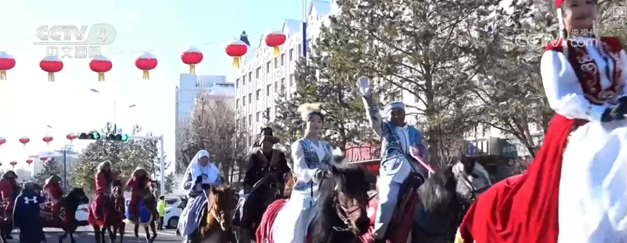 在新疆最北部的阿勒泰,临近春节,当地举办“雪都阿勒泰·社火迎新春”展演活动,人们穿上喜庆的服饰和特色民族服装,弹起冬不拉、踏歌起舞。多个巡游方队宛如一条流动的彩带,将新春的喜庆与吉祥传递给各族群众。