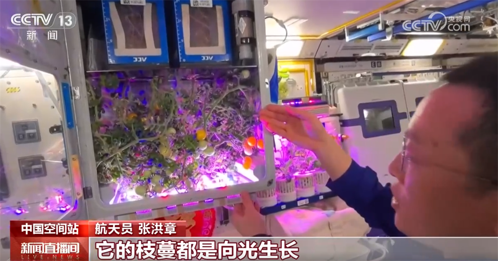 航天员 张洪章:大家好,今天带大家来打卡天宫里的治愈系角落——我们的太空番茄。打开太空番茄培养装置的盖门,它的枝蔓都是向光生长,这种向光生长的姿态特别有感染力。这套太空番茄的培养装置叫气雾培,由中国航天员科研训练中心的科研团队研制的。它通过将水气雾化的方式,可以大幅提高水的利用率。另一方面,特别科学定制了LED光谱,可以大幅提高能源的利用效率,从而获得了一幅长势喜人的太空番茄生长画面。