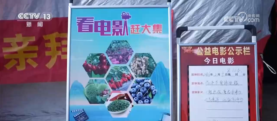 放映大棚外,电影元素深度融入乡村市集的烟火气中,打造“电影+”多元惠民服务综合体,融合同步开展的老电影海报展、惠民演出、书法送福、非遗手造展销、本地农特产品展销等活动,让乡亲们边看电影边逛集市,看大戏、办年货、品书香。据估算,现场赶大集的群众累计超过3万人次。