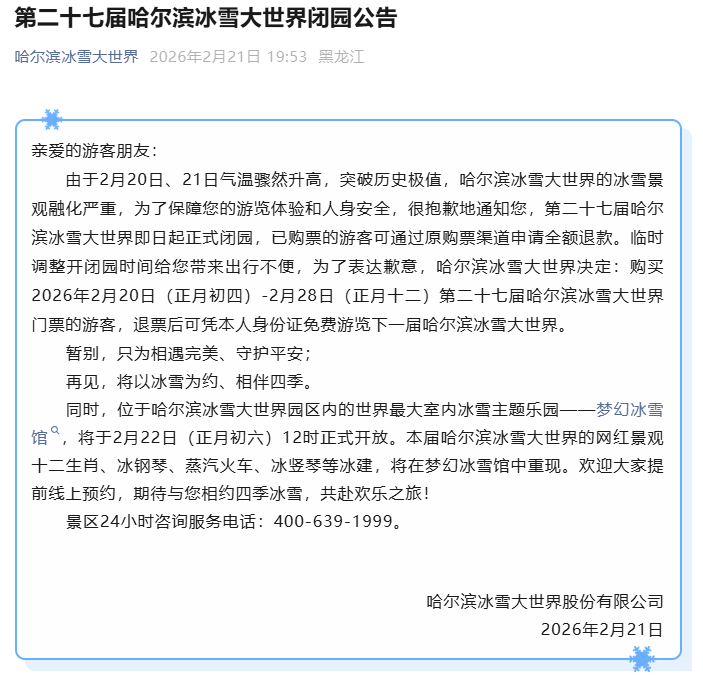 央视网消息:2月21日晚,哈尔滨冰雪大世界发布公告,由于2月20日、21日气温骤然升高,突破历史极值,冰雪景观融化严重,第二十七届哈尔滨冰雪大世界即日起正式闭园,已购票的游客可通过原购票渠道申请全额退款。同时,位于哈尔滨冰雪大世界园区内的世界最大室内冰雪主题乐园——梦幻冰雪馆,将于2月22日(正月初六)12时正式开放。