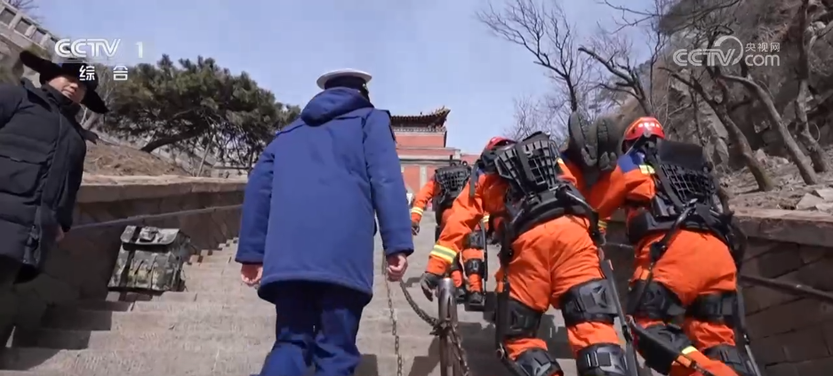由于泰山地形复杂,消防车无法应用,传统救援全靠指战员的“铁脚板”与“铁肩膀”,而今年开始外骨骼设备的应用,让救援力量在崎岖山路上的机动能力大幅提升。泰山消防救援站政治指导员李鹏介绍,外骨骼设备的最大负重载荷达到70公斤,减轻消防救援人员在盘道救助和山岳救援过程中对身体关节的冲击,减少体能消耗,从而提高救援效能。