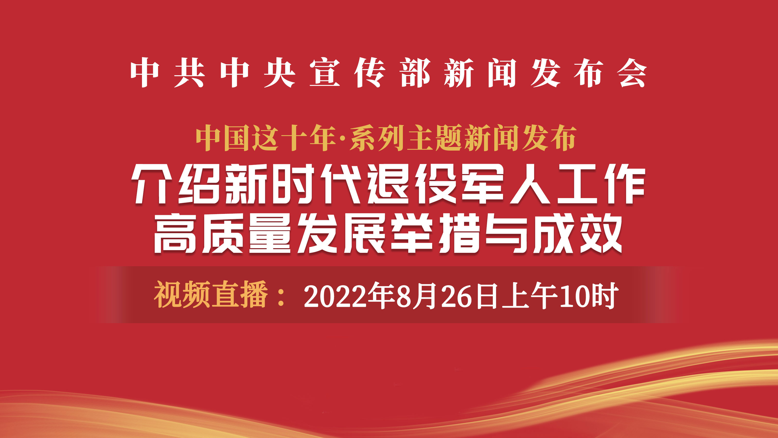 中共中央宣传部定于2022年8月26日(星期五)上午10时举行“中国这十年”系列主题新闻发布会,请退役军人事务部副部长马飞雄介绍新时代退役军人工作高质量发展举措与成效,并答记者问。