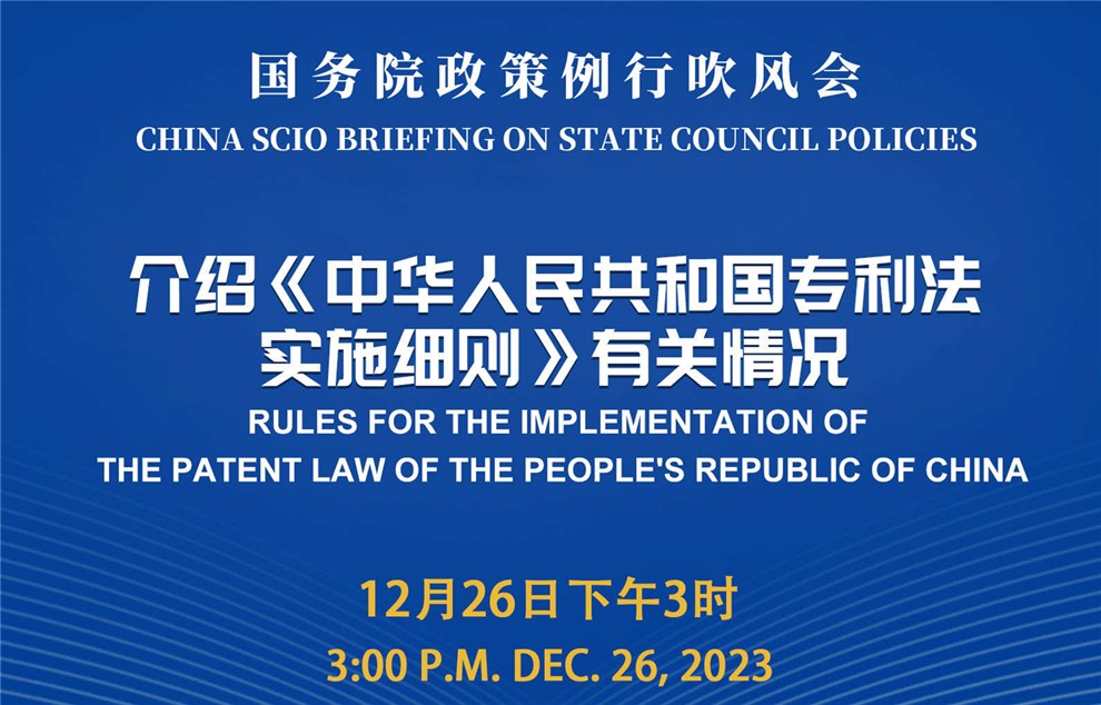国务院新闻办公室定于2023年12月26日(星期二)下午3时举行国务院政策例行吹风会,国家知识产权局局长申长雨和司法部有关负责人介绍《中华人民共和国专利法实施细则》有关情况,并答记者问。