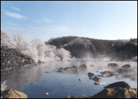 八景中最驰名的吊水楼,系熔岩浆凝结而成,古称“发库”,位于湖的最北端,水流经这里,落入由熔岩坑塌陷而成的深潭之中,形成了瀑布。瀑流从约20米高的潭岸跌落,在宽约40米的熔岩床面翻滚、咆哮,溅着白色浪花,似玉如银的水珠,在五彩缤纷的霞光中闪烁,迸发出连续不断的春雷之声,其势雄浑磅礴,豪迈坦荡,颇为壮观。严冬来临,瀑流凝结成冰帘,挂在潭壁之上,宛如舞台上下垂的银幕,别是一番景观。枯水期又另有奇趣,熔岩床因常年被流水冲刷,再经碎石的磨蚀,便琢成大小深浅不同的熔洞,光滑圆润,十分别致。