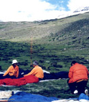 一路上对于要经常检查队员的脉搏和体温,以便及时的了解队员们身体情况。高原的斜阳在地面上洒下了长长的影子,客车也到达了4767米的昆仑山口。虽然许多队员还是依然会下车来活动筋骨,但数量已经开始减少,这是高原反应开始向他们发起了挑战有个队员出现了头疼的现象。