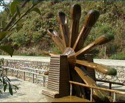 在水车博览园内,除了数十架大小不等的各式水车外,还汇集了世界各地的各种利用水动力原理制成的生产工具。