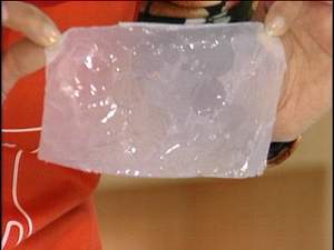 要知道塑料袋的吸油效果究竟怎么样,恐怕还是要实际验证一下。让我们在盘子中放满水,再滴几滴油,然后我们剪一片和盘子差不多大小的塑料袋。我用的是超市常用的这种比较厚的购物袋。现在要看看这个塑料袋的吸油效果了,一定看好。(塑料袋完全铺在表面,迅速拿出)所有的油滴附在塑料袋表面。平时用的塑料袋不止这种,再看看那种超薄的塑料袋吸油效果怎么样。