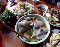 连城一带盛产芋头,像这样芋子粉做成的水饺,在连城的很多地方也叫桃子,你可以很容易的吃到,除此之外,客家自酿的米酒味道也是十分的香浓,你到那儿不防一试。
