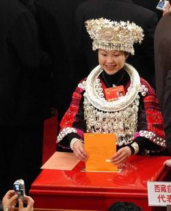 A deputy to the ongoing National People's Congress session is voting at the sixth plenary meeting of the First Session of the 10th National People's Congress in Beijing Sunday morning.