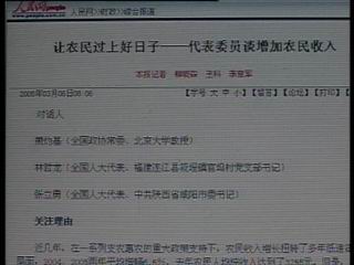 全国人大代表 黑龙江省正大集团 董事长 姜鸿斌:但是取消农业税之后,也带来了一些新问题,你比方说农资涨价的问题,这个我希望政府能够像取消农业税那样,用宏观控制的手段,让农民切实得到实惠。这是提高农民收入的一个积极有效的途径。
