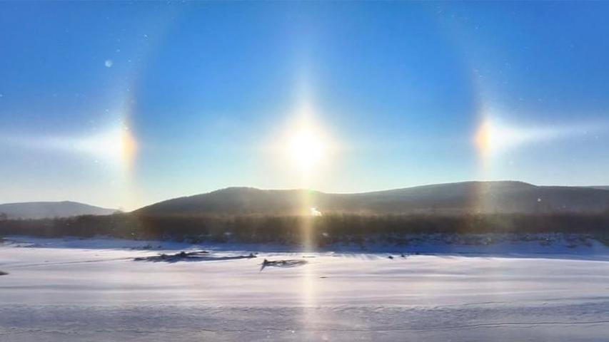 12月8日上午,内蒙古呼伦贝尔根河市上空迎来幻日景观。天空中仿佛有三个太阳同框悬挂,呈现中间高、两边低的规整布局。