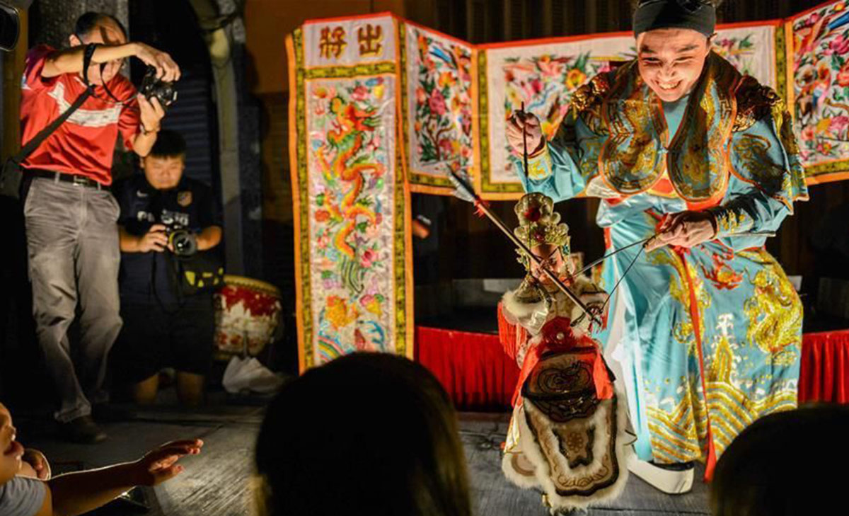 9月15日,在马来西亚吉隆坡茨厂街,人们观看木偶戏表演。 当日,马来西亚首都吉隆坡当地华人社团在茨厂街举办“老街走月”庆中秋活动,内容包括舞狮舞龙、戏曲表演、花灯游行等。