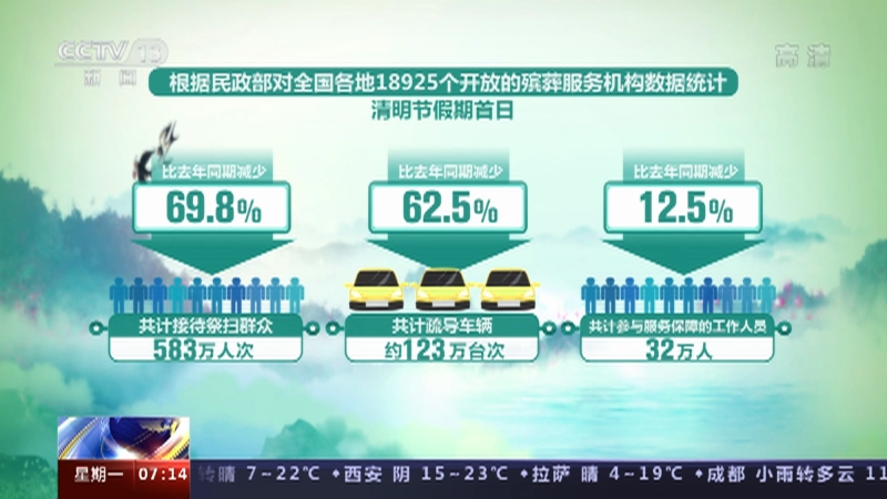 记者4月5日从民政部了解到,今年清明节假期期间,各地累计接待现场祭扫的群众1754万人次,比去年同期下降74%;进行网络祭扫的群众2156万人次,比去年同期增长192%。