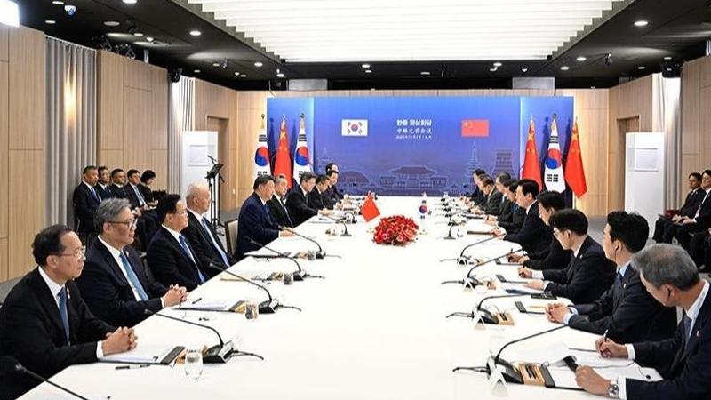 当地时间11月1日下午,韩国总统李在明同中国国家主席习近平在庆州博物馆举行会谈。