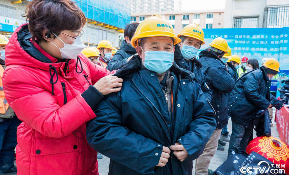 2021年1月30日,在中建三局呼和浩特市第十四中学施工项目,就地过年的工人在试穿赠送的棉衣。春节将至,内蒙古呼和浩特市新城区人社局、总工会、劳动监察大队的工作人员走进中建三局呼和浩特市第十四中学施工项目现场,开展“迎新春送温暖、稳岗留工”慰问活动,为就地过年的外来务工人员和管理人员赠送春节礼物,让他们在异乡感受到节日的温暖。