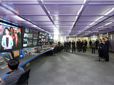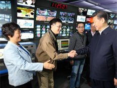 习近平在中央电视台《新闻联播》导控室向工作人员了解新闻制作导播流程